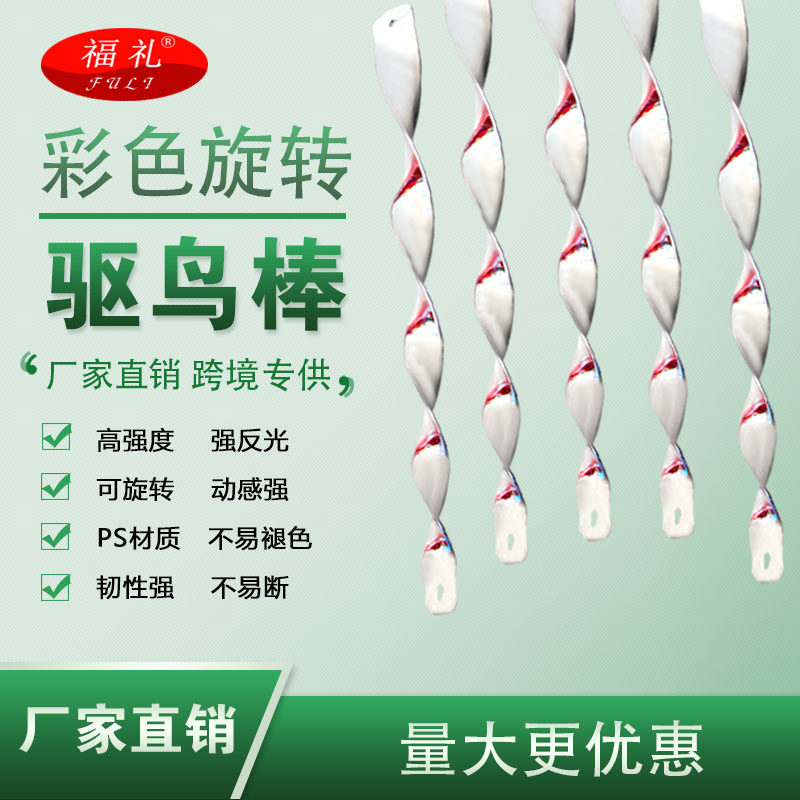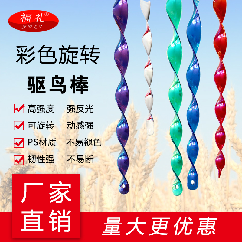 烟台美燕材料包装材料有限公司生产的【福礼】牌驱鸟棒,有多种型号。30cm螺旋红色、绿色、紫色、蓝色、银色;50cm螺旋红色、绿色、紫色、蓝色、银色,10支一包装。驱鸟棒由于是螺旋的棒体,随风更易旋转反光,不同长度适合不同的植物,悬挂于果树上即可